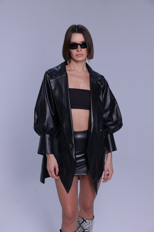 Belted black leather Jacket.