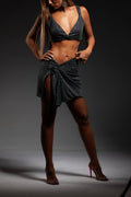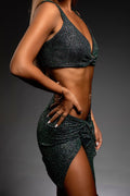 V-shaped blingy greenery sparkle top with a brooch and a mini skirt.