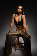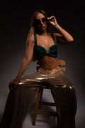 olive green cropped top with a strap.